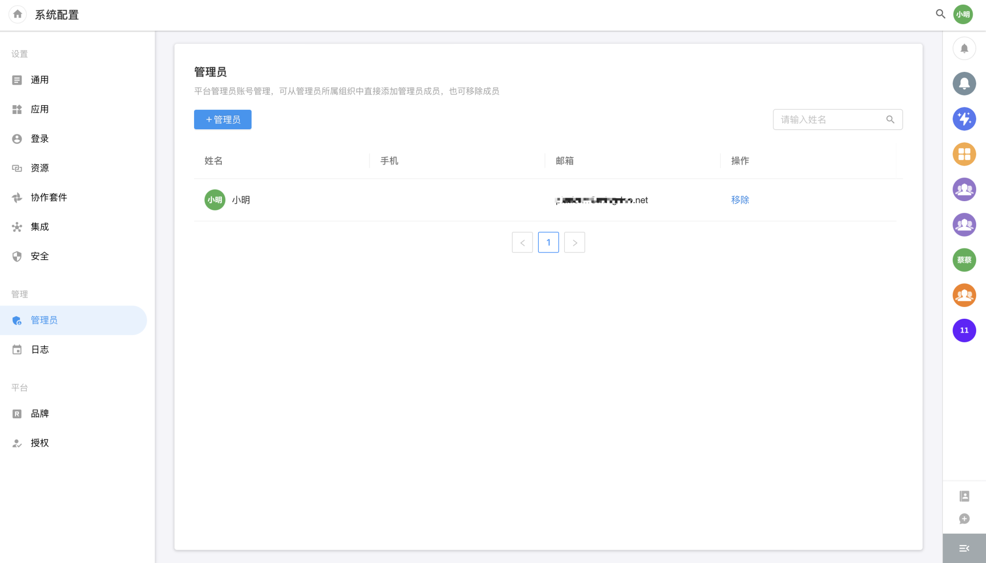 As shown above, the [Admin] module is used to configure the personnel who can view and manage the [Platform Mgt] page, and only the personnel of the organization to which the current user belongs can be added. The default admin is the initial user of the platform installation and registration (it is not recommended to set too many admins to avoid misoperations; when the admin changes his position or leaves the organization, his role of admin be handed over to another member in this module).