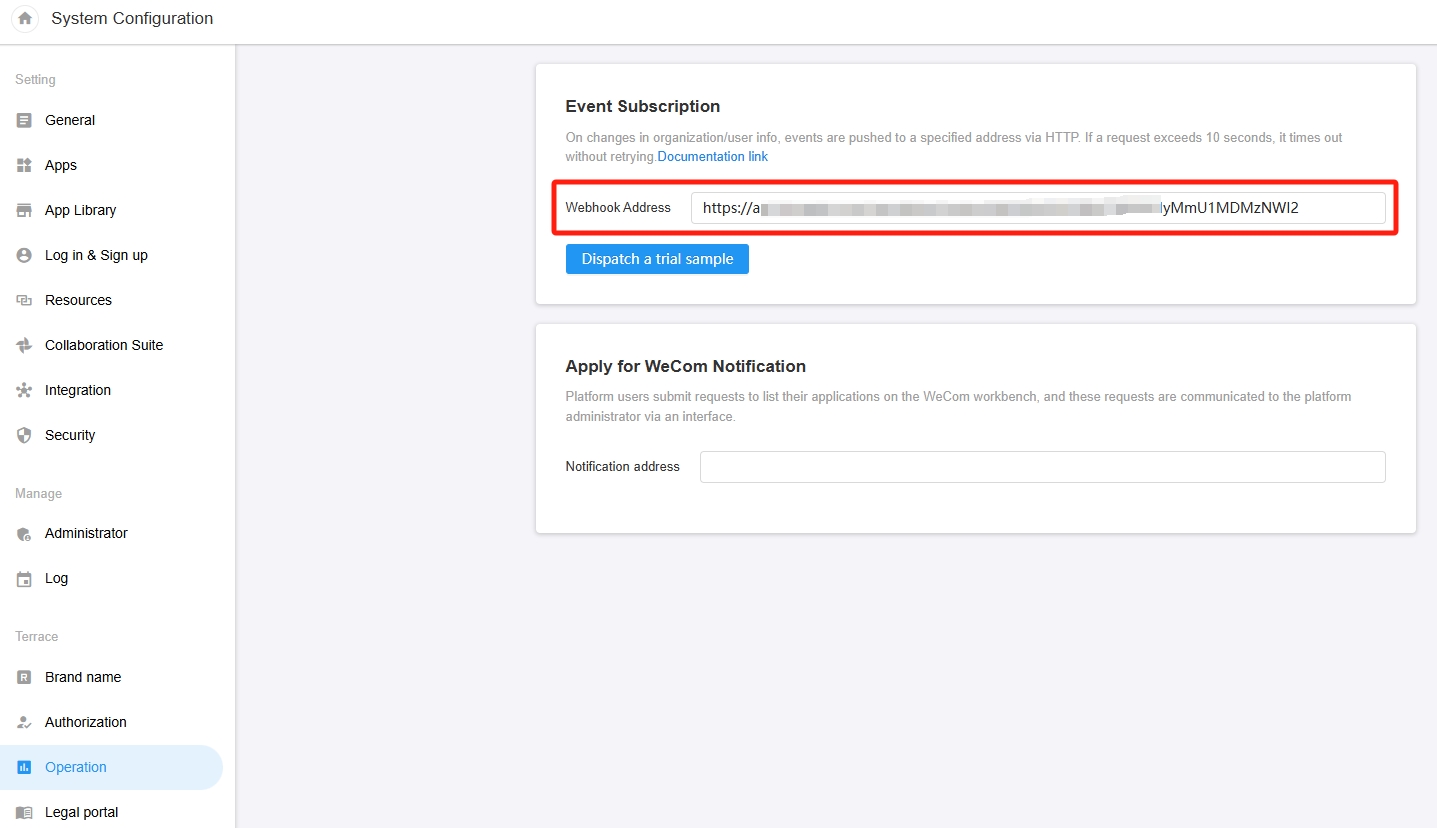 As shown in the above figure, it supports pushing events related to organizations and users within the platform to the configured address. The push will be triggered when creating organizations, changing organization names, registering new users, canceling user accounts, or users joining/leaving organizations.