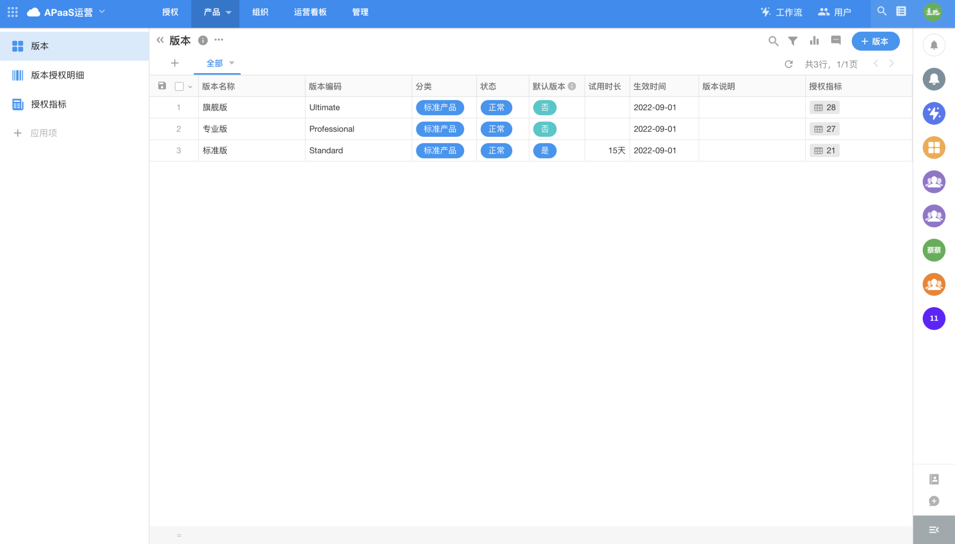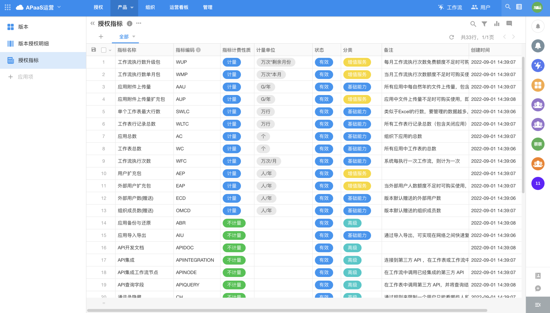 Product management includes authorization metrics and editions, among which, authorization metrics are the basic function items or function collections provided by the HAP platform. Authorization metrics information cannot be added, edited, or deleted (if there are new items, operators can synchronize them through the timed workflow "[Authorization Metrics] Data Synchronization"); partners can define their own editions in the [Edition] module (the edition is a collection of authorization metrics). The edition information can be edited (including the authorization metrics in the edition, which can be added, deleted, or modified), but cannot be deleted. When the platform is initialized, the Standard Edition, Professional Edition and Ultimate Edition are provided by default.
