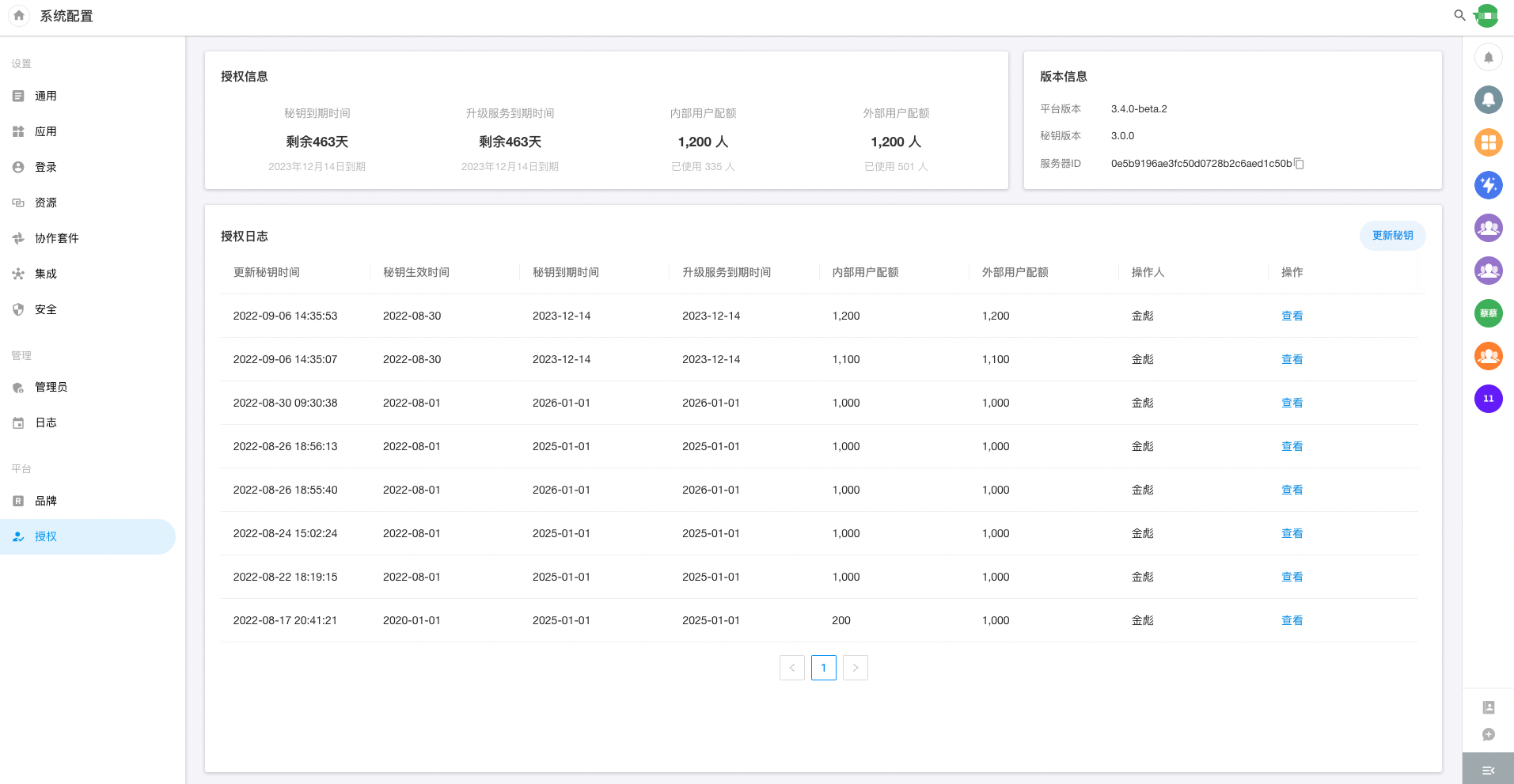 Click [Update Key] button, and enter the latest authorization key to authorize successfully, the latest authorization of the platform will take effect immediately.