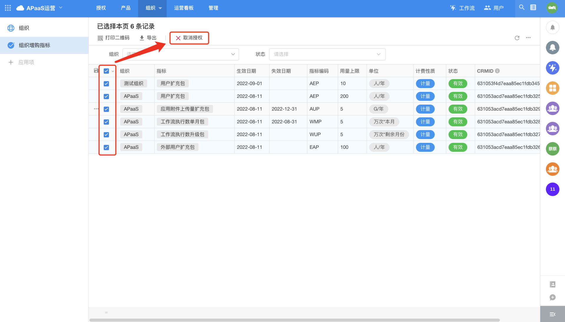 Cancelling authorization is to cancel the "organization's additional purchase metrics" (after cancellation, the additional purchase metrics, the additional purchase metrics in the organization will be invalid). It is applicable to the cancellation of an organization's additional purchase metrics when there is an authorization error.
