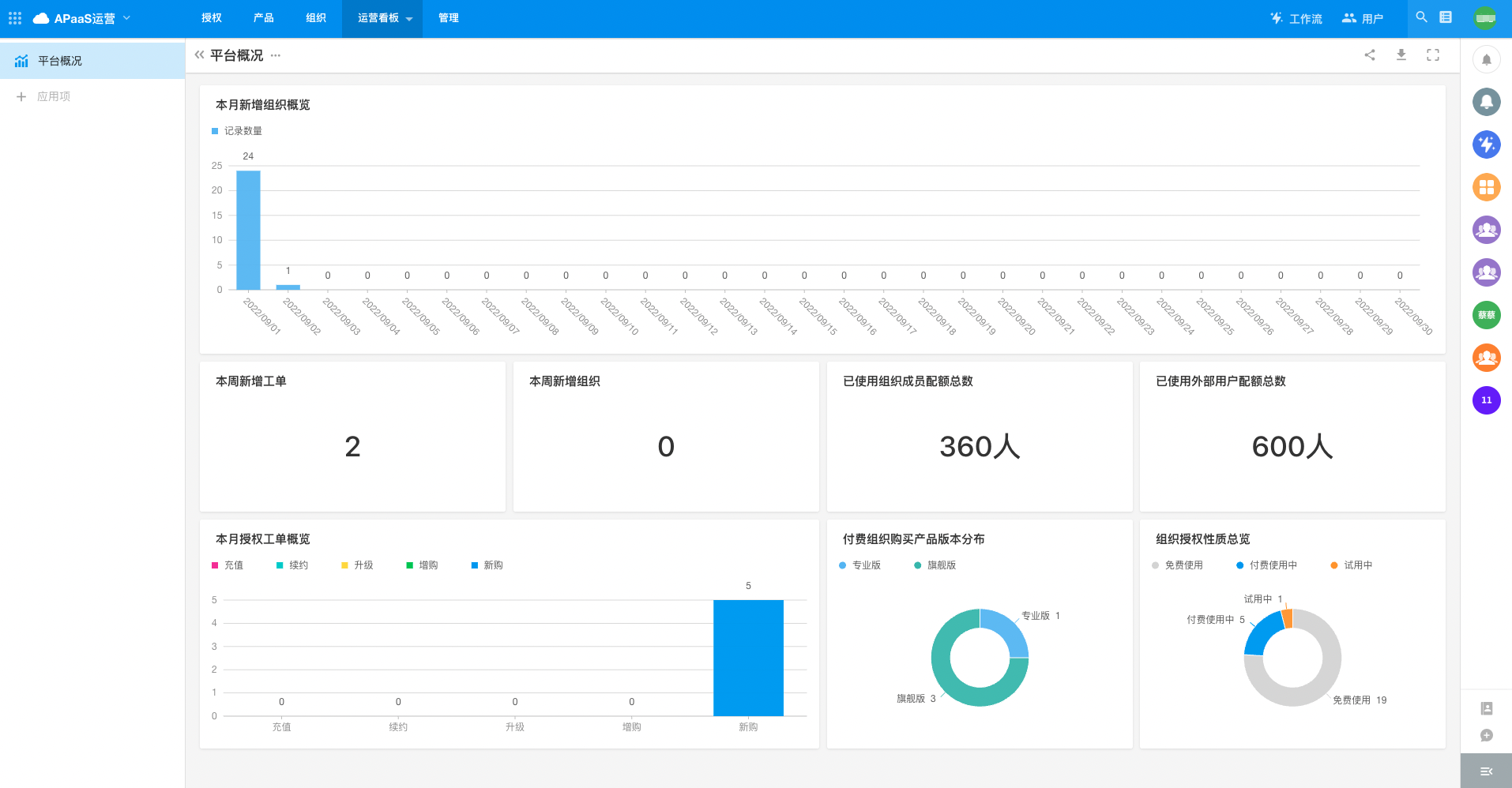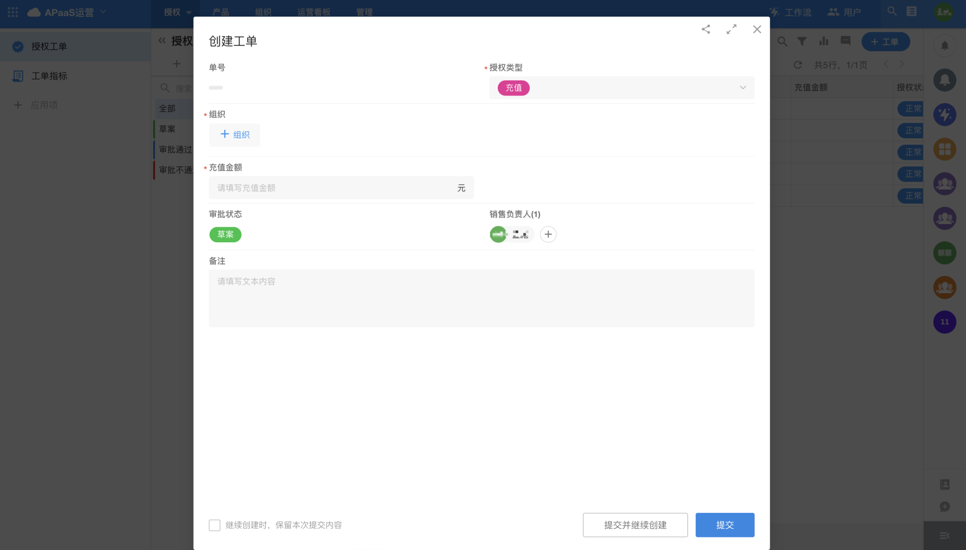 As shown above, the "APaaS Operation" application provides a standard platform operation and management system, after the platform user signs up (the default organization created at registration is the free edition, and its function is consistent with the official free edition of HAP),the partner's sales personnel can apply for authorization for platform users in the "Authorization Work Order" module. After the work order is created, it will be approved by the operating personnel, and the authorization will be completed after the approval is completed.