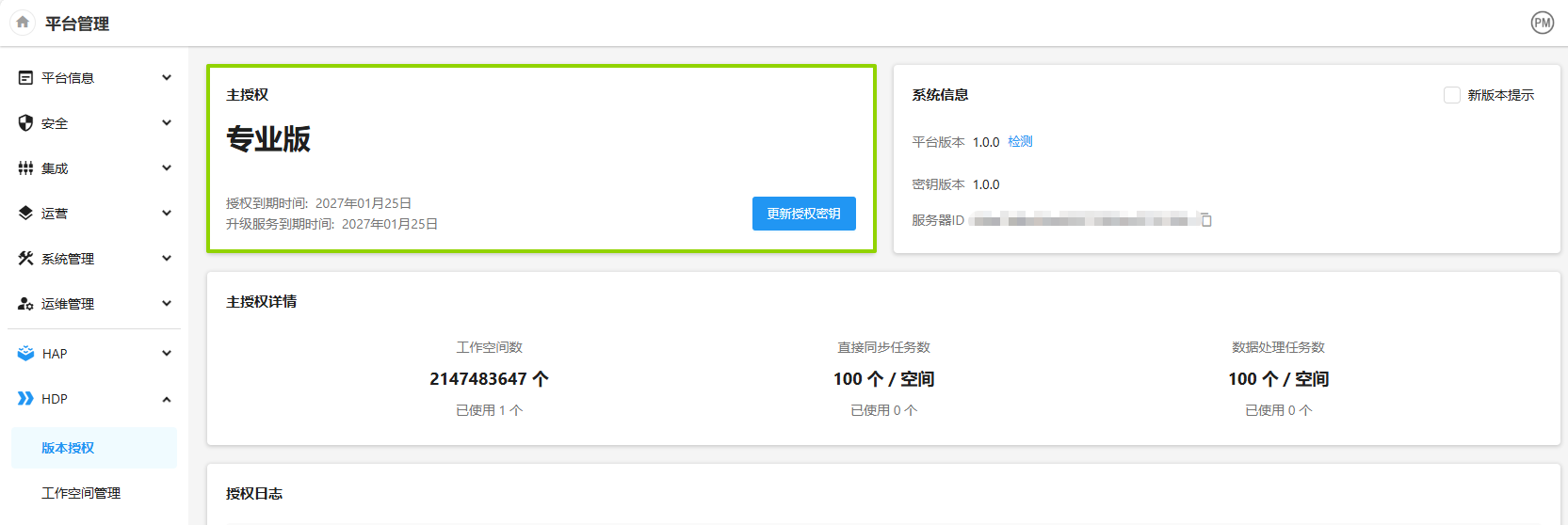 FAQs使用问题更新授权密钥本页总览更新授权密钥 点击头像显示菜单列表,然后进入平台管理(仅平台管理员可见) HAP 平台管理 => HAP => 版本授权 授权密钥分 主密钥 和 增值产品密钥,注意绑定入口 HDP 平台管理 => HDP => 版本授权